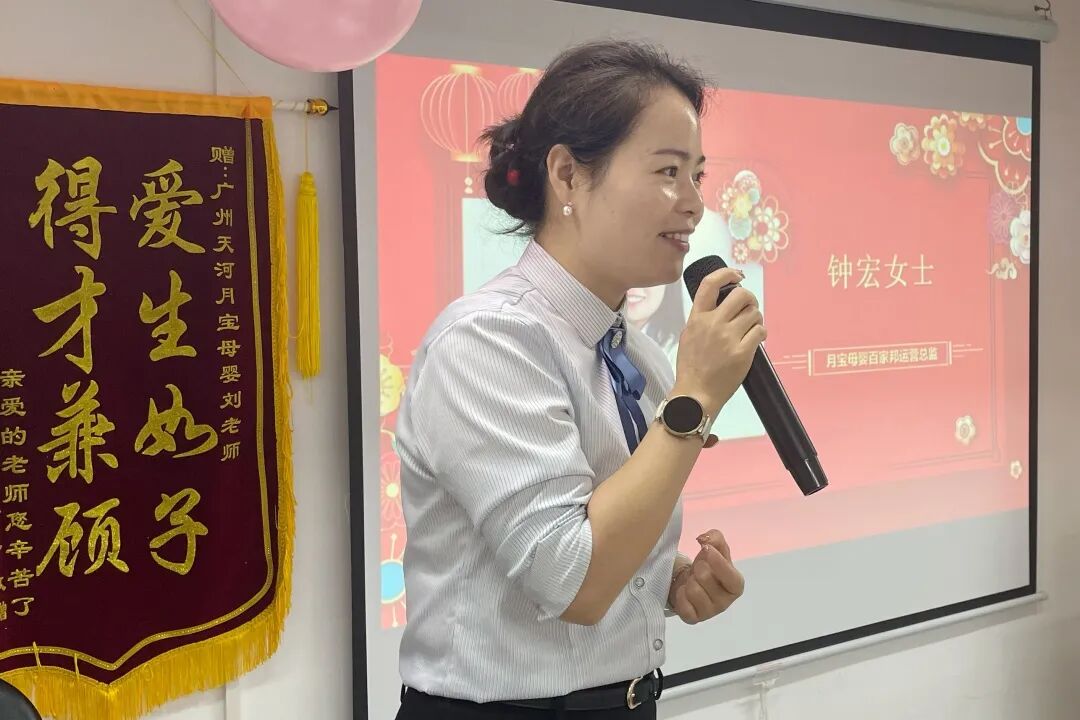 广州月宝母婴&百家邦技能培训学校 运营总监钟宏女士发表开班致辞,她表示公司在母婴服务行业沉淀积累了多年,教学培训质量,学校学习环境设施,实习场所渠道,就业推荐等都非常完善,能为学员成长保驾护航。