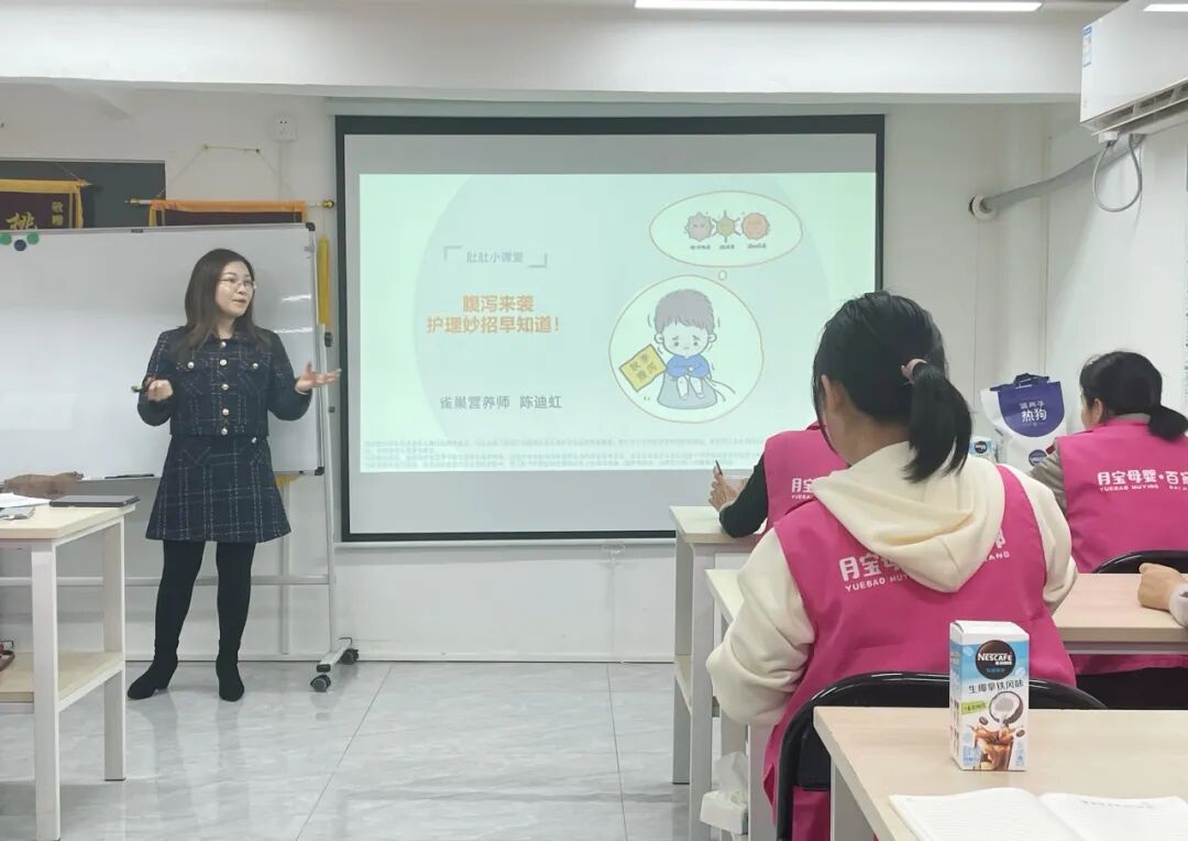为提高月嫂、育儿嫂的综合素养,提升服务团队对常用的母婴产品,护理工具等认知与迭代更新知识,月宝母婴会定期邀请不同的知名母婴品牌,相关合作的母婴机构的优质大牌导师,跟我们月嫂、育儿嫂新老学员举行专题的分享学习讲座。这期特别邀请负责雀巢医护线培训宣讲的专业营养师陈迪红老师为大家带来“宝宝腹泻护理小妙招”专题课程。